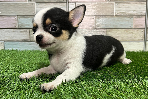 ブラック・タンにホワイトが加わった毛色。顔や胸、足先に白が入ることで、より華やかな印象になります。