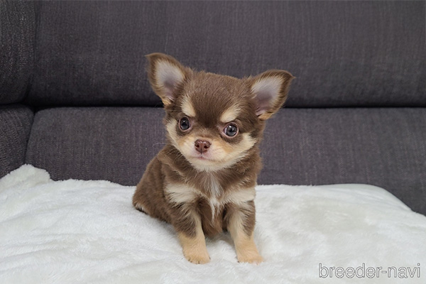 やわらかな薄い黄淡色で、チワワの大きな瞳が引き立つカラー。完全な単色は少なく、白や濃淡が混じることもあります。